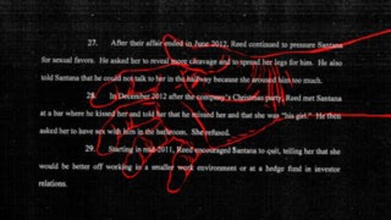 Santana alleges that she and Reed began an "intermittent affair" between 2011 and 2012, and that she was uncomfortable saying no to his advances because of his position as her boss. At the same time, Santana claims, Reed "singled her out for professional scrutiny," criticizing her, for example, for being too outspoken at meetings. She says that he began pressuring her to quit in mid-2011, telling her she'd be better off, the suit says, "in a smaller work environment."