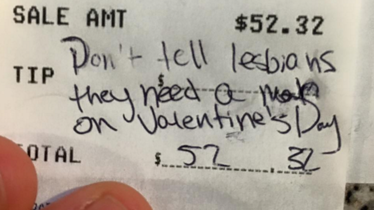 But the ladies won the day. When the check came, they left, in lieu of a tip, a nugget of wisdom: “Don’t tell lesbians they need a man on Valentine’s Day.” (The check is pictured above.)