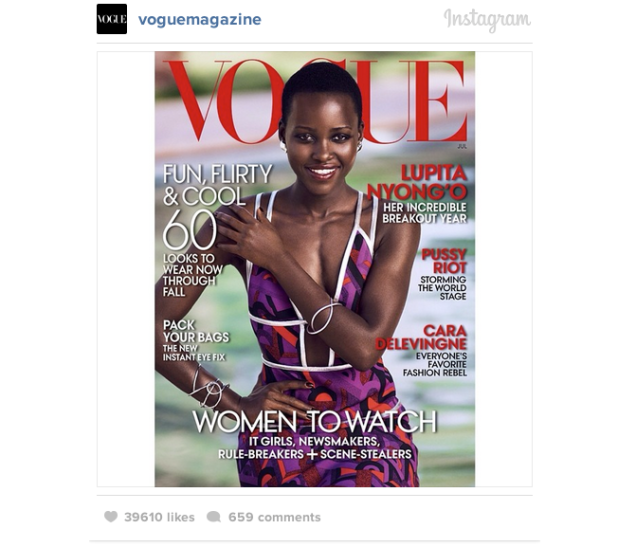 In general, this issue looks very ra-ra, women rock, with cover lines like "Women to Watch: It Girls, Newsmakers, Rule-Breakers + Scene Stealers," Cara Delevingne as "everyone's favorite fashion rebel" and Pussy Riot "storming the world stage." Nyong'o fits right in.
