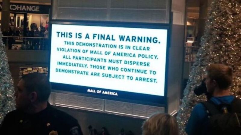 On Saturday, protesters gathered inside the Mall of America to draw attention to police violence, just like many groups of people have, in many different cities, to increasingly alarming levels of backlash and resistance. The Mall of America is a public space big enough to hold Yankee Stadium seven times over, but it is also private property, and the peaceful protesters were warned that they would be violating property rights.
