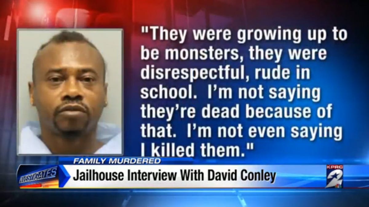 David Ray Conley, who Houston police say has confessed to murdering his ex-girlfriend, her husband, and six children (including his own son), has tried out a novel defense—telling a local radio station that his ex was raising his children to be “monsters” and “disrespectful.” Conley also insisted he loved his own son “to death.”