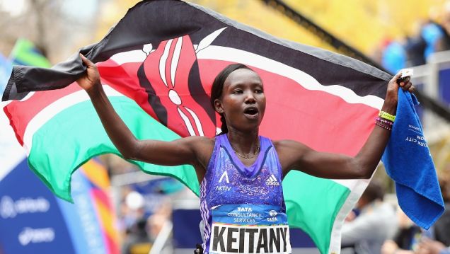 Mary Keitany of Kenya crosses the finish line to win her second New York City Marathon. She finished the marathon in two hours and 24 minutes. Aselefech Mergia of Ethiopia finished second and Tigist Tufa, also of Ethiopia, finished third.