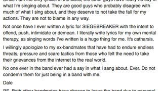 As of the evening of April 4, Lyons continues to update Siegebreaker’s Facebook page, most recently linking to an article regarding the breakup with the comment “Great to see that there’s still some ethics in journalism...”