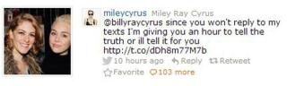 Miley Cyrus, now a child of divorce like the rest of us, posted a confrontational tweet at Billy Ray with a picture of herself with a woman later identified as Broadway actress Dylis Croman, who was in Chicago in the 2012 production that starred her dad.