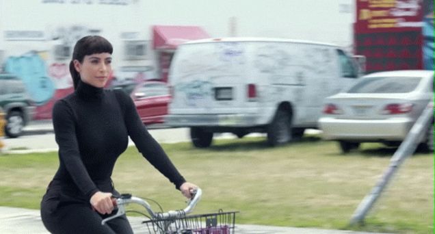 The 2.5-minute spot begins with an unconscious Kim, her wedding ring glimmering brightly in the foreground, lying next to a bike that has recently fallen over. We then flash back to, oh, 10 seconds earlier, and see a fully conscious Kim (with bangs!) riding a bike filled with cans of Hype Energy® around a parking lot before suddenly tipping over - presumably because she was too busy looking at the Hype Energy® production crew and not the obstacles ahead of her?