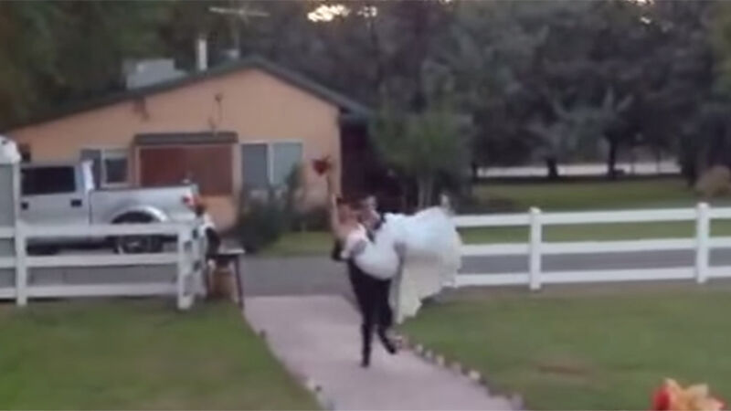Carrying one's partner over a threshold is an archaic practice that is meant to symbolize a husband stealing a wife into a new life/making sure everyone knows the bride isn't that excited to get some peen. It's fussy and old and should be done away with, especially because unlike the olden days, when no one had cameras and pictures had to be painstakingly scraped into walls, now everyone has a cell phone which will take a shitty video of you tripping over your feet and dropping your NOT TOO EXCITED ABOUT THAT PENETRATION partner on the floor before falling on them. And, since the sound is so good, your wedding day will always be remembered as the one where someone loudly screamed "oh shit!" in the video.
