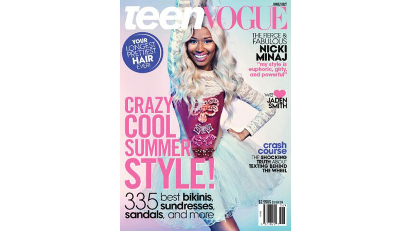 Nicki Minaj uses the word "euphoric" to describe her style, but one could use that same word to describe her borderline manic facial expression on Teen Vogue's June/July cover. [MissJia]