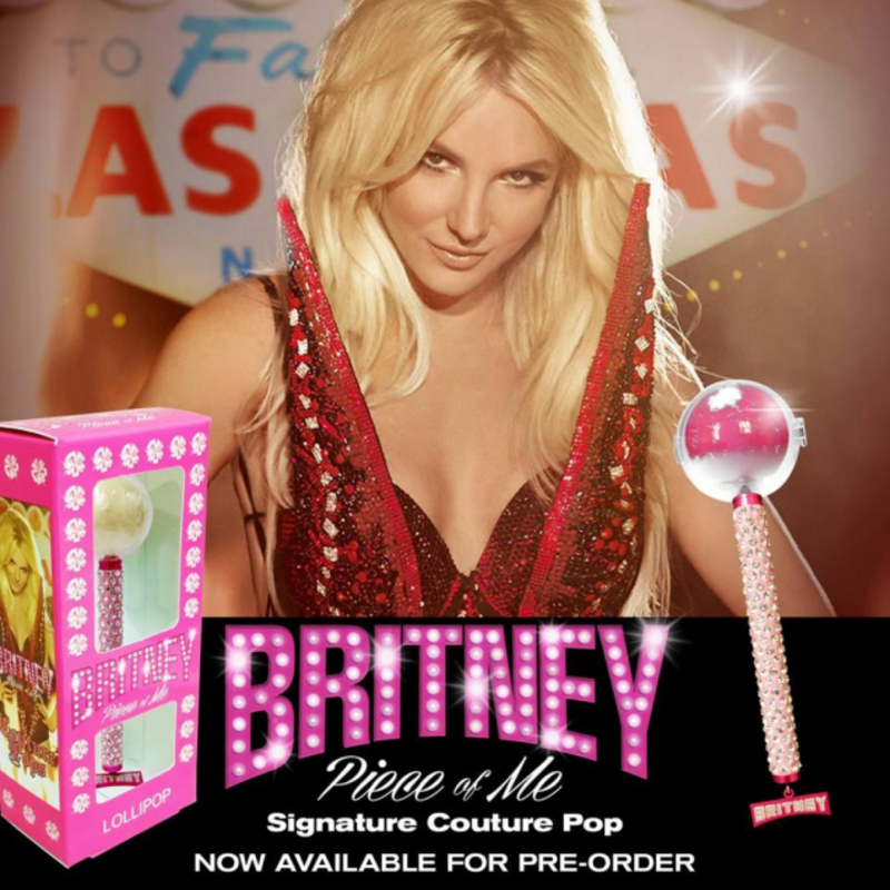 A Las Vegas-based company named Sugar Factory is on a mission to turn suckers into highly fashionable red carpet accessories with their line of Couture Pops, which appear to be hard candy balls on top of rhinestone-encrusted handles. It looks useless, ridiculous, and perfect as a piece of Britney Spears merchandise. See, she officially has her own Couture Pop Signature Series, and it's called Piece of Me. Lots of pink, rhinestones, all in all, very Britney.