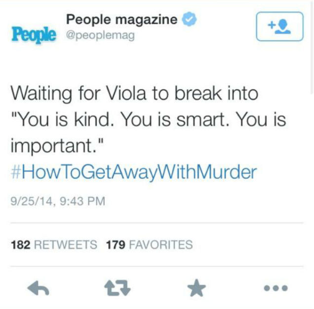 So they realized they had tweeted something that many of their followers and fans told them was offensive. Normally you expect a carefully worded apology from a public relations executive doing damage control. (They usually start with "we deeply regret" and contain bullshit like "if we offended anyone, we are sorry.") But that's not what happened. They kept on live-tweeting the show and moved right into live-tweeting How To Get Away With Murder, starring Viola Davis.