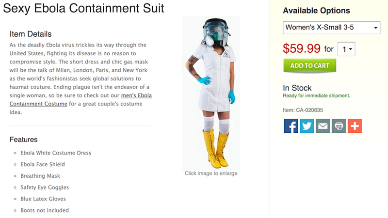 It was only a matter of time. We're a week out from Halloween, and between the Ray Rice costumes, the Adrian Peterson costume, and this sexy ebola containment suit, Halloween 2014 is shaping up to be the worst ever.