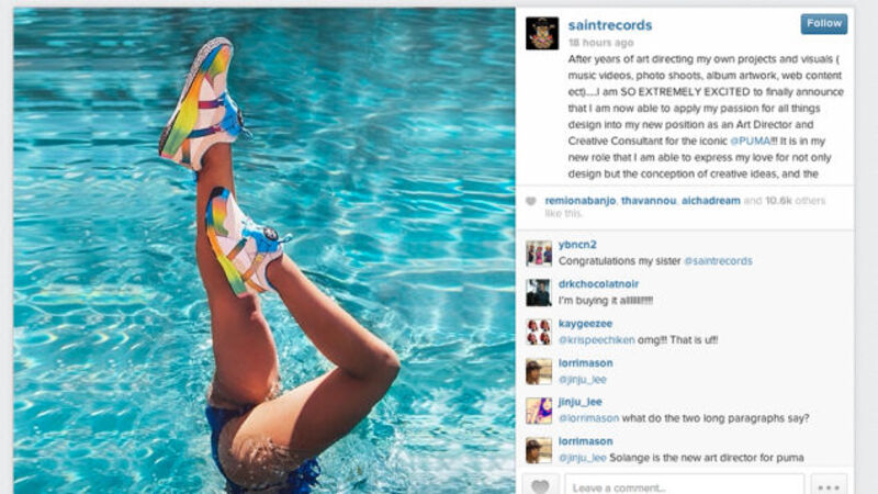 Professional cool girl Solange is now an art director and creative consultant at Puma. Apparently she's teamed up with some other artists and designers to create sneakers inspired by the sights and sounds of Brazil: "The shit is wild, and come February I hope you will be just as in love as I am."