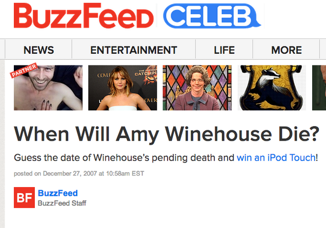 Remember that one time, back in 2007, when Buzzfeed asked readers to "Guess the date of Winehouse’s pending death and win an iPod Touch"? (h/t Tyler Coates)