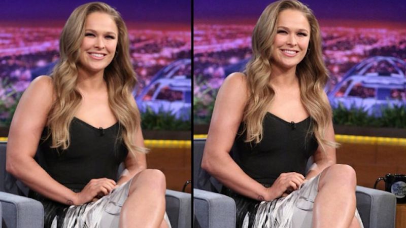 The photo, a shot of Rousey’s appearance on The Tonight Show with Jimmy Fallon, was Photoshopped to make her arm appear smaller. In a caption of a side by side comparison, she writes: