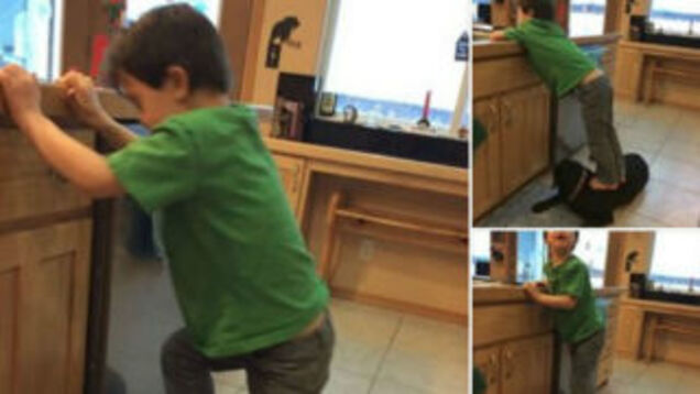 Trig, 6, who has Down Syndrome, is shown stepping on the back of the family's black Labrador while it lies on the kitchen floor in order to reach the sink. The dog appears unruffled.