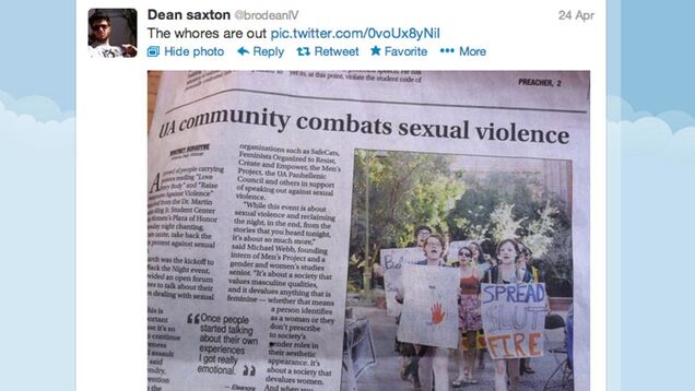 ...Saxton, a junior studying classics and religious studies, said his sermon was meant to convey that “if you dress like a whore, act like a whore, you’re probably going to get raped.”