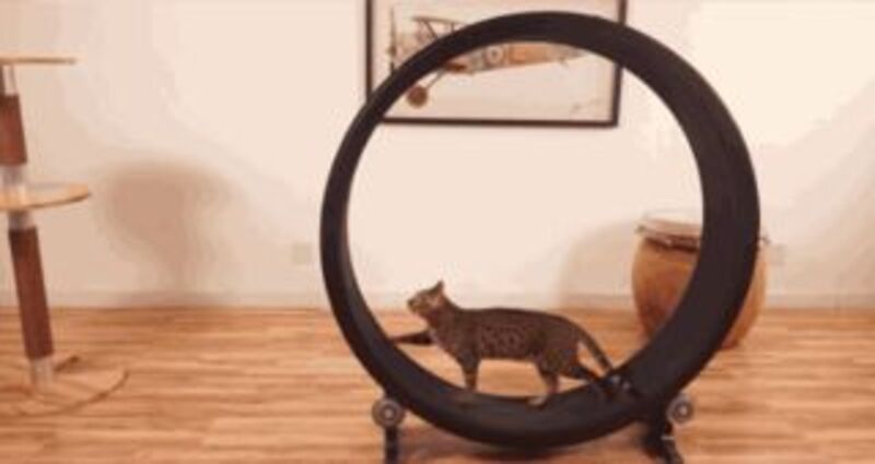 It's called One Fast Cat. At 48-inches across, the circular, cat-powered cat-treadmill is a gigantified version of the exercise wheels commonly associated with lab rodents. It's designed to help your feline companion exercise indoors, when it isn't busy bringing death and destruction to the outside world.