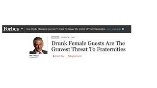 If you blinked at all, even for a second yesterday, you may have missed a doozy of a story that Forbes ran and very quickly deleted. Which is a shame, since the headline was "Drunk Female Guests Are the Gravest Threat to Fraternities," and the only thing more hilariously evil than much of the piece that followed was…