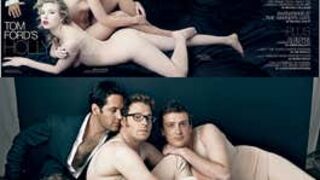 Inside the April issue of Vanity Fair, Jonah Hill, Seth Rogen, Jason Segel and Paul Rudd spoof a 2006 cover with Tom Ford, Keira Knightley and Scarlett Johansson. But with bodysuits. What a cop-out.