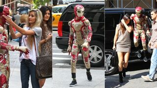 Let's just say you're a 14-year-old actor/rapper — the son of an actor/rapper and an actress/singer — and you're dating a 15-year-old pseudo-Kardashian. What do you wear while shopping in Manhattan in the hours before your big movie premiere? If you answered "Iron Man suit," you are correct, sir. Step right up and…
