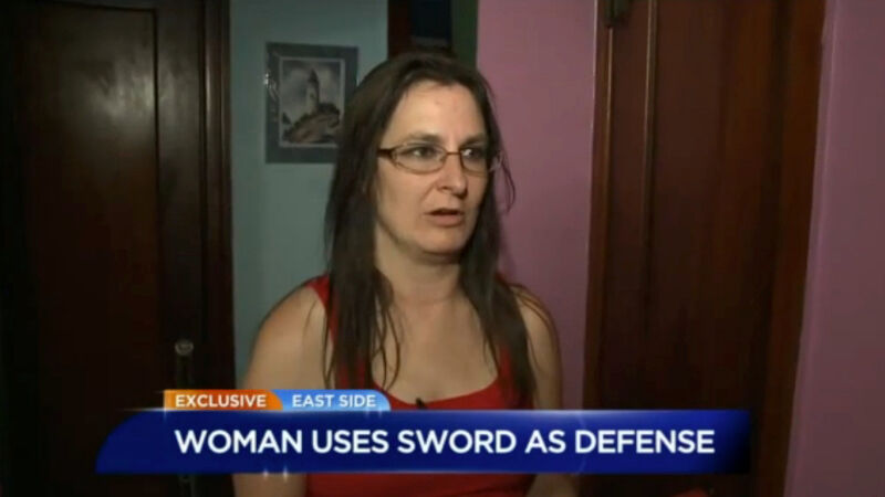 Karen Dolley, a 43-year-old Indianapolis woman who skates as “Foul Morguean” with the Naptown Roller Girls, cornered a man who’d broken into her home on Thursday night, using only her wits, bravery, and a Japanese-styled sword she owns, called a “ninjato.”