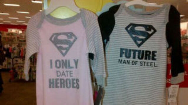 Target Canada is the latest retailer to offer remarkably stupid, sexist superhero-themed clothes. This time, the outfits are footed onesie pajamas for kids (I guess it's never to early to instill the message that while men can be superheroes, women can only date them). While the boys outfit boasts "Future Man of Steel," the counterpart pink outfit for girls proclaims "I Only Date Heroes." Great.