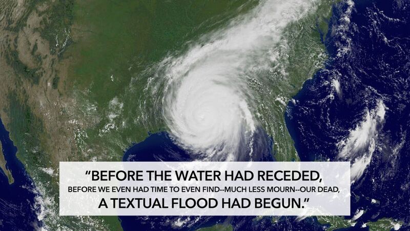 And it was accompanied by another one. Before the water had receded, before the people of the Gulf South had time to even find—much less mourn—our dead, a textual flood had begun. Writers of all types—poets, essayists, activists, and, of course, journalists—were recording the history of the hurricane in real-time. They were writing up a storm.
