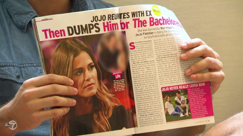 That didn’t stop them from prompting the men to suggest these magazines were not plants, despite the fact that it’s commonly known that Bachelor contestants are not allowed reading material. “Vinny had a couple of magazines that had stories about JoJo and her ex-boyfriend Chad,” is how Alex presents this wealth of information.