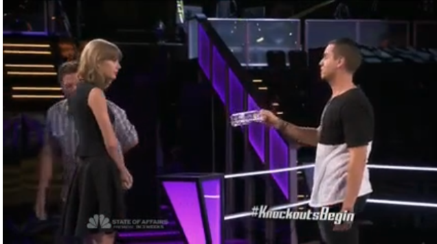 Swift began a two-day stint on The Voice last night, advising contestants as they entered the knockout rounds, and she was a pretty great teacher—she gave each singer super-sharp pointers to better their performances, advising them to sing certain parts in falsetto, to stop doing weird growl-inflections at the end of each line and, most importantly, to feel the songs, rather than just perform them. They were tips that could only come from someone with years of experience, and she proved that if this whole POP STAR thing doesn't work out, she has a flourishing vocal production career at the ready if she wants it. She was encouraging and seemed to like every song presented ("Excellent!" "I love that song!"), and naturally, each contestant was over the moon at her presence, both because she is Taylor Swift and because she was there to help them.