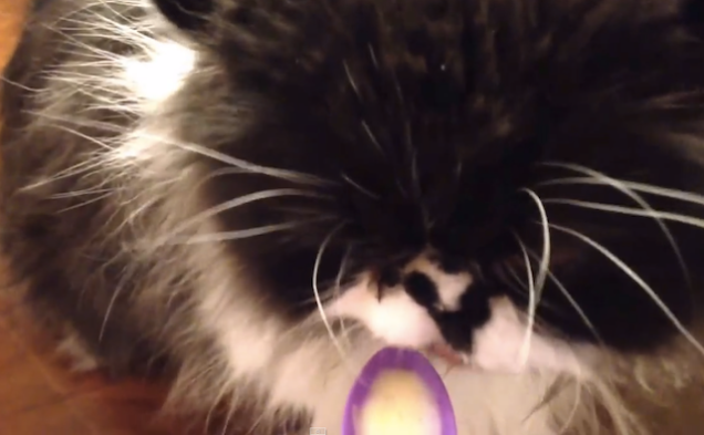 Like this fluffy kitteh, who lets out a sort of terrifying scream at the 5-second mark, with what looks like your standard vanilla dripping out the side of its mouth, aware that his or her cranium has been locked into a tailspin while his/her tastebuds demand more (more, I say!). But then, as a boss cat does, it continues to finish its serving off of a little purple spoon, damned if any ice cream will go to waste.