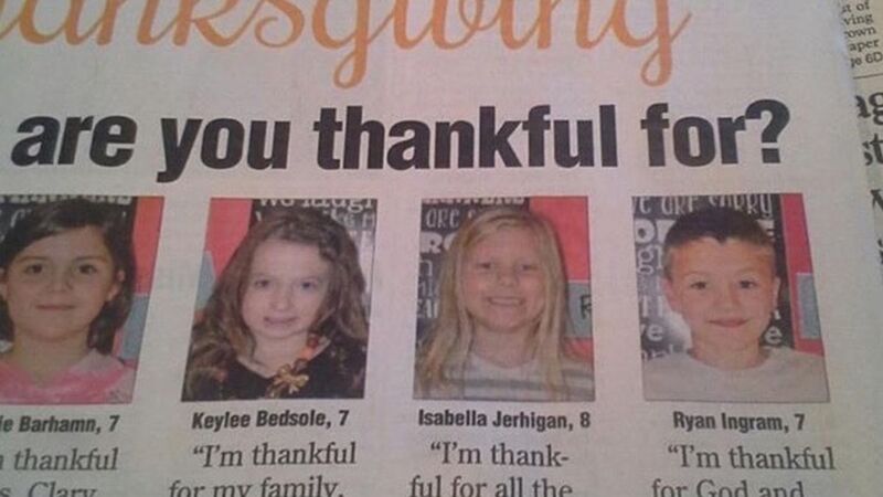 Several hours ago, this photo of a newspaper began circulating around Twitter and Imgur. It originated on Reddit, but it ended up in my mailbox (several times!), and on this day of giving thanks, there's nothing more inspirational than what little Isabella Jerhigan is thankful for: Dead people. Why? Because they tried.
