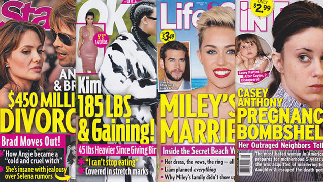 Welcome to Midweek Madness, where we find ourselves continuously intrigued by the fact that every single tabloid is obsessed with pink and yellow. This week, Angie and Brad are over because of Selena (they’re not), Kim can’t stop eating (yes she can), Miley’s married (no she’s not), and Casey Anthony is pregnant (I need to leave Earth).
