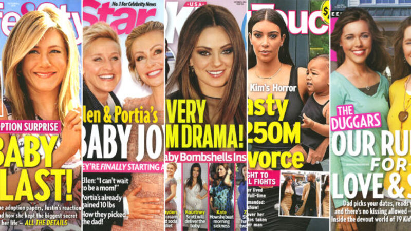 Ellen Degeneres and Portia de Rossi are having a baby. We know this because Portia "appears to have gained about 10 lbs." and is also "glowing." Also, a photo exists of Ellen touching Portia on the stomach, meaning that all the signs have aligned. Apparently, the couple picked an unnamed (NOT FAMOUS) sperm donor who was "well educated and charitable, with few health issues in his family." Why couldn't the editors just make up that Lenny Kravitz was going to be the sperm donor, like in that recent tabloid story about Queen Latifah? This is lazy gossip-mongering. I am disappointed. In other news, the young woman whose butt was groped by Robin Thicke has come forward with her story, in case you had lingering questions about it. She says that she met the disgraced former Leighton Meester back-up singer at a party; shortly after, he led her to a dark back room, where they had sex. "Minutes after their copulation," as Star puts it, he introduced her to his wife all smug-like. Robin Thicke is a big dick, etc. Moving on: Rihanna spends $25k a week on her hair, according to a source. "She has a team of experts around the clock to cater to her every hairstyle whim," says the informant. Literally anyone in her position would do the same. The American dream is spending $100,000 a month on luxurious wigs. Finally, Mila Kunis is going to give birth any day now, which means it's high time for a story about how Demi Moore is teetering on the brink of emotional collapse, not to mention old. Here is the thesis statement of this piece: "With Ashton's impending fatherhood, she feels like she's too old to find that kind of love again." 'Kay. Whatever.