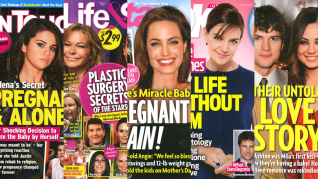 Welcome back to Midweek Madness! Every Wednesday, Callie Beusman and I "read" the celebrity weeklies so that you don't "have" to. Guess what? Not one single magazine had Beyoncé/Jay Z/Solange as the main cover story today. Instead? Unsolicited Uterus Updates for Angelina Jolie and Selena Gomez and cult activity from the Smiths and Jenners. Tabloids avoided the black people. Interesting.