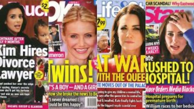 Okay, here's the cover story. Kate Middleton had a false alarm about having her baby but she's not actually having her baby and it's all okay!!! She's been having Braxton Hicks contractions, and one day had really sharp pains and went to the hospital, and then 24 hours later was cleared. "She kept saying 'Are you sure?'" says the source, which is cute, imagining Kate repeating that over and over again. Since then, Kate's hired round-the-clock nurses, and is *STRESSIN* because William is going to be in East Asia for business for awhile, and the stress is *SHOWIN* because she didn't dye her roots? Whatever. The article is followed by a nasty little two-page spread about who is losing weight better than who, post-baby Blake Lively or post-baby Kelly Clarkson. Guess which person the tabloid thinks is doing it better? Later, my horoscope says "Life is moving at top speed, and you have no time to waste on unproductive people," so I think I'll take that as my cue to move on.