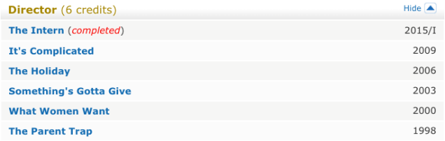 The film was originally supposed to star Tina Fey and Michael Caine, but moved to another studio where the lead roles transitioned to Reese Witherspoon and Robert De Niro. After Reese passed due to “scheduling conflcts,” they brought Anne Hathaway in. That early production shuffle might explain the atypical six-year gap between it and It’s Complicated, Meyers’ last film. Just look at her filmography as a director — not more than three years between each movie.