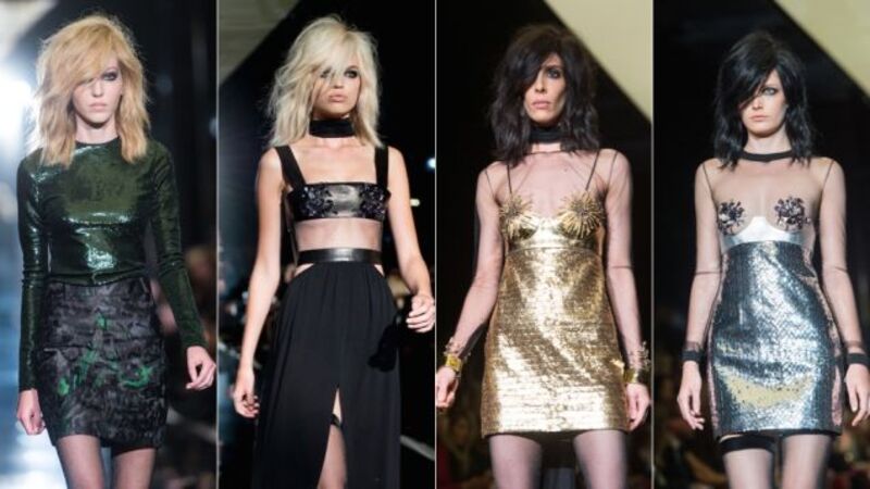The collection was an obvious nod to glam-rock, with a sea of shaggy-haired models emerging in leather, lace, glitter, transparent chiffon and tight miniskirts. It was reminiscent of Ford's time at Gucci and also of Hedi Slimane's stuff for Saint Laurent, but perhaps more provocative than either — I repeat, nipple pasties played a prominent role in the line.