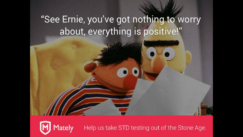 The chummy duo is the subject of an ad (pictured above) for Mately, which sells at-home kits for HIV and STD testing. Sesame Street takes issue with this unauthorized use of the puppets’ likeness in a campaign that associates Bert and Ernie with STDs.