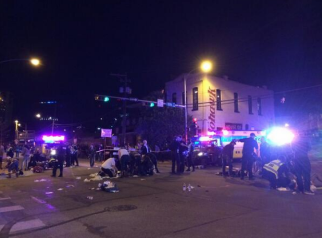 Scott Jakota from Indiana said the car that came through the barricade was a gray Prius, and he was one of the first people hit. He said the driver gunned the car, "and I was thrown up in the sky." He appeared to have a leg injury and was being helped by his friends.