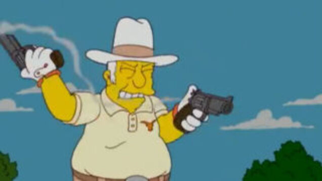 Male city council members communicate by shooting guns into the ceiling, probably. Screengrab via The Simpsons/FOX