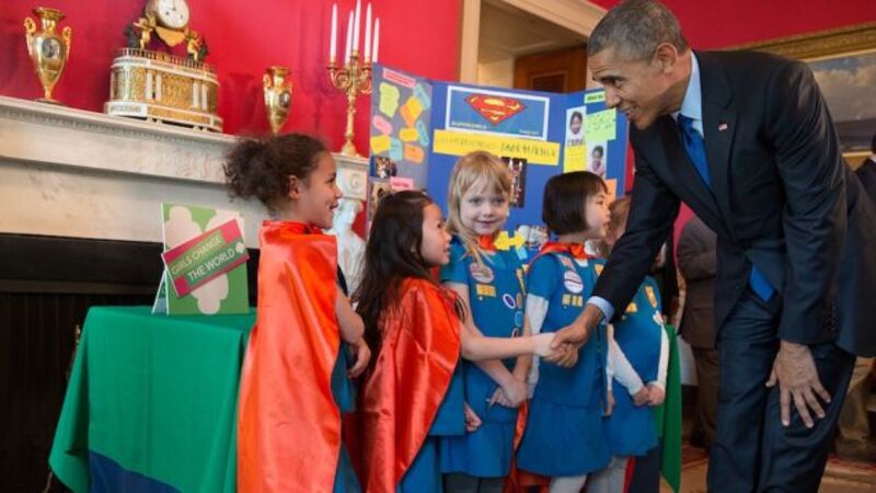 NBC News reports that a group of cape-clad Girl Scouts from Tulsa, Oklahoma stood out this year, with their page-turning robot made of Legos. Obama very much enjoyed hearing six-year-olds talk tech: "This is a quote. They said, 'It's just a prototype,'" he told reporters afterward. Watch this presidential group hug and die of cute overload: