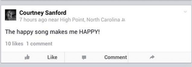 32-year-old Courtney Sanford was driving on Business 85 in High Point, North Carolina when her car crossed the median and collided with an on-coming truck. Sanford's car burst into flames. Emergency services were called to the scene at 8:34 AM. Investigators confirm that at 8:33 AM, seconds before Sanford collided with the other vehicle she had been using Facebook to post the following status update about Pharrell's "Happy: