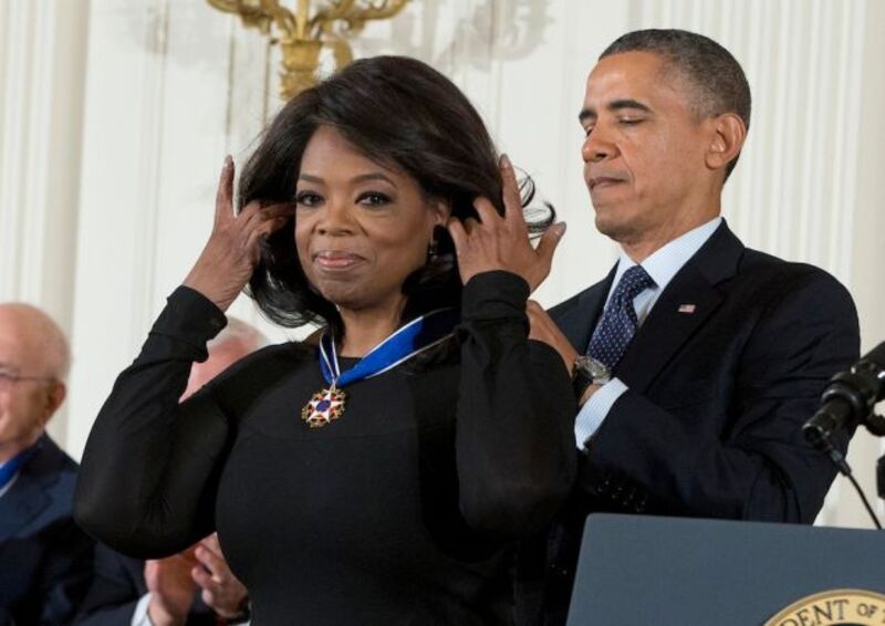 [Women's rights activist Gloria Steinem, left, gestures toward Oprah Winfrey, as Oprah gives a "thumbs up" after Steinem during a ceremony in the East Room of the White House in Washington, Wednesday, Nov. 20, 2013, where President Barack Obama awarded Presidential Medals of Freedom. At center is fellow recipient judge Patricia Wald. Image via Jacquelyn Martin/AP]