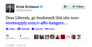 Yesterday Fox News contributor Erick Erickson Tweeted a now-deleted link to a hanger wholesale supply store as a statement intended for pro-choice women (or, as Ericson calls them, "kid killers.")